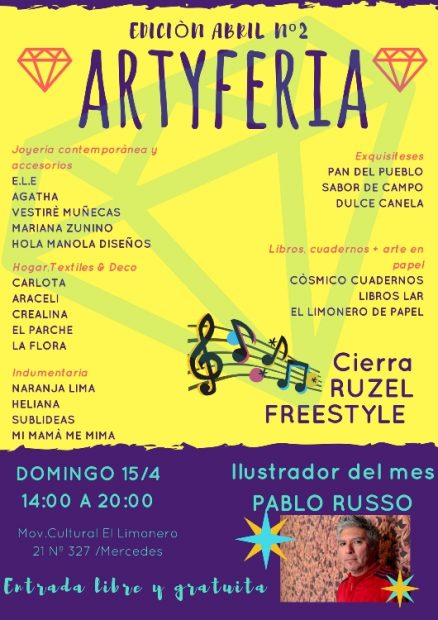 El pròximo domingo 15 de abril, entre las 14 y las 20 horas se realizará la Artyferia, un espacio de difusión cultural y venta de artesanías y productos realizados por emprendedores, artistas, artesanos, escritores, ilustradores, fotógrafos y diseñadores de Mercedes y de localidades vecinas.