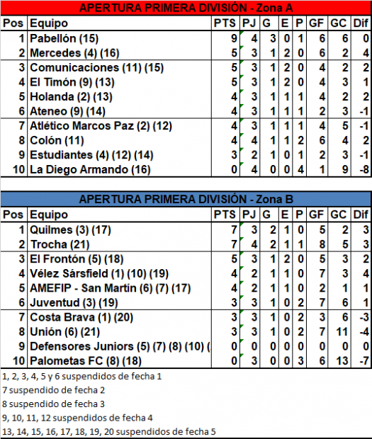El mal clima y la inundación en Mercedes sólo permitió que se jugara un sólo partido por la quinta fecha de un torneo Apertura de la Liga Mercedina que ya suma veinte partidos adeudados y que a partir del próximo fin de semana se irán saldando. En Marcos Paz, Atlético derrotó 2 a 1 a Colón de Luján y obtuvo el primer triunfo en el campeonato, ya que hasta el momento había cosechado una derrota y un empate. Por el lado de los de Luján, es la segunda derrota en el torneo, ya que en el debut habían perdido ante Pabellón.