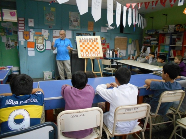 El primer día realizó una exhibición de partidas simultáneas de ajedrez con 22 alumnos de la Escuela y el miércoles pasado dio una clase mostrando a los niños una parida magistral de ajedrez jugada por el Gran Maestro y múltiple Campéon Argentino Don Miguel Najdorf, en Varsovia en 1935, conocida como «La Inmortal Polaca» y que es una de las más famosas paridas de ajedrez de la Historia.
