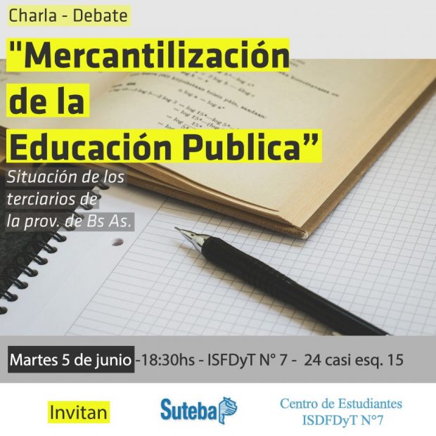 El próximo martes 5 de Junio a las 18:30hs en el ISFDyT N° 7 se llevará a cabo, con invitación a toda la comunidad educativa una charla – debate cuya temática será la «Mercantilización de la Educación Pública».