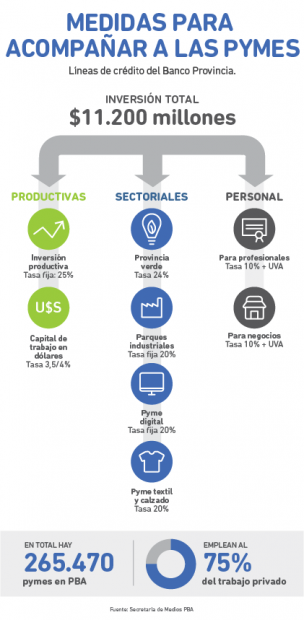 La gobernación de la provincia de Buenos Aires anunció una serie de medidas para promover el desarrollo de las pequeñas y medianas empresas, a través de nuevas líneas de crédito «muy blandos y a tasas bajas» financiadas por el Banco de la Provincia, a partir de una inversión de 11.200 millones de pesos.