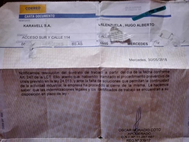 “Vamos a ver si ahora salen hablar pavadas, los que dijeron que karavell se retrotraería de los telegramas de despidos y la fábrica estaría funcionando” dijo Hugo Valenzuela expresando su realidad por medio de la red social Facebook y dando además cuenta que “ayer empezaron a llegar los nuevos telegramas que confirman, que fuimos despedidos. La próxima vez no le mientan más a los vecinos de mercedes” dijo, presumiblemente en relación a la tarea infructuosa de la delegación del Ministerio de Trabajo, a cargo de Jorge Retegui, tanto en Provincia como en Nación, sin llegar a dar ninguna solución a la situación.