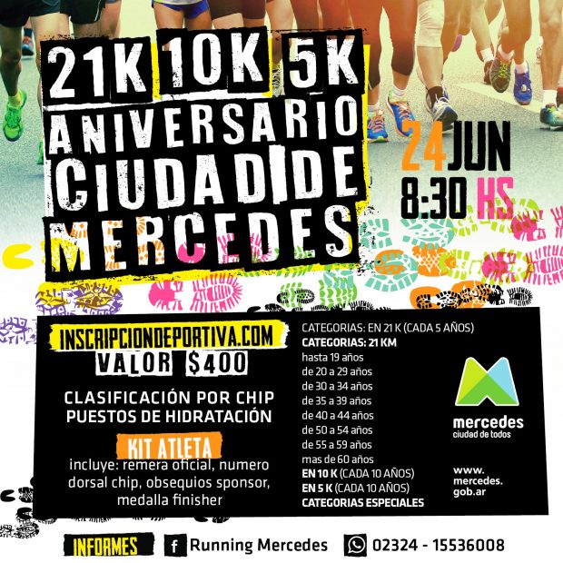 Las inscripciones se realizan en la web: www.inscripciodeportiva.com. Más información llamando al celular 02324 – 15536008 o ingresando en Facebook “Running Mercedes”