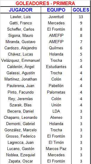 Juventud de Suipacha, que tras ese sorpresivo inicio con dos derrotas ahora lleva siete triunfos ininterrumpidos, venció 2 a 1 a Defensores con dos gritos del imparable Luis Lawler, y sigue a dos puntos de El Frontón, que le propinó una goleada histórica a Unión en el Tito Crosetti, por 9 a 1.