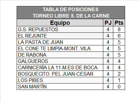 En más resultados, El Cone Te Limpia-Montajes Vila y la Pasta de Juan finalizaron sin tantos por lado, cero a cero. La gente de De Rabona, ya suma cinco puntos, a tres del líder. Le ganó cuatro a cero a San Martín. Nicolás Godoy, Martín Landini, Santiago Ziverra y Miguel Lobos se anotaron en las estadísticas finales. Finalmente, Carnicería la11-Mercedes es de Boca también anotó varios goles, cinco ante Los Pibes, el último y actual campeón. Damián Amaya, Nahuel Giménez, Walter Gómez, Nelson Ortiz y Héctor Sotelo fueron los autores de convertir el quinteto.