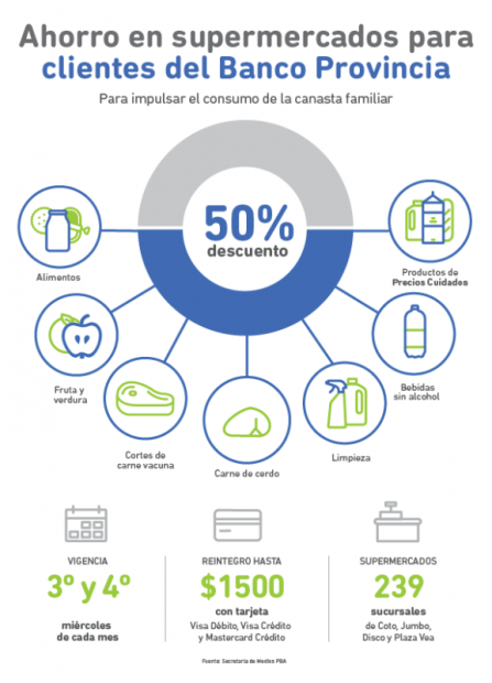 Desde el Banco Provincia y la Gobernación de la provincia de Buenos Aires relanzaron el programa de descuentos del 50%  en supermercados para clientes del Banco Provincia, que comenzará el miércoles 18 de este mes. Entre los clientes del banco se encuentran los trabajadores de la provincia que reciben su salario a través de la entidad bancaria.