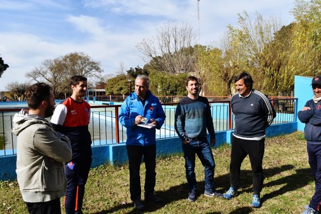 El intendente Ustarroz, junto a Pablo Massa, coordinador de la Dirección de Deportes y Pablo Luna, “Negro” Dell Oro, Silvio Erramuspe, Roberto Araya, Néstor Palacios por parte del Club Estudiantes durante la mañana del sábado último recorrieron el predio ubicado en calle 30 bis donde erigen sus canchas, piletas, sectores al aire libre y los vestuarios que tiempo atrás con apoyo municipal se construyeron.