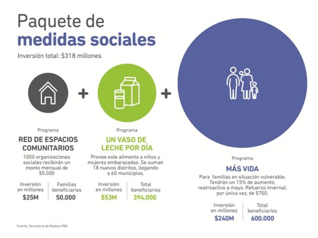 Durante la jornada de este miércoles, la gobernadora de la provincia de Buenos Aires, María Eugenia Vidal, anunció un paquete de medidas sociales para asistir a los bonaerenses. Son beneficios para el acceso a la compra de alimentos y leche, y ayuda para los comedores comunitarios. Mercedes fue incluida en el programa «Un Vaso de Leche por Día» que ayuda a complementar la alimentación de niños y mujeres embarazadas. Proveen de envases de medio kilo de leche en polvo a municipios y organizaciones civiles.