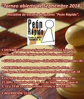 Una vez más, la Escuela de Ajedrez Peón Rápido, organizó un torneo que se llevará a cabo en el Club Del Progreso y que se denominará Septiembre 2018 y que nuevamente, como los que habitualmente se juegan en la sede de calle 25, será con sistema Suizo, a siete rondas.
