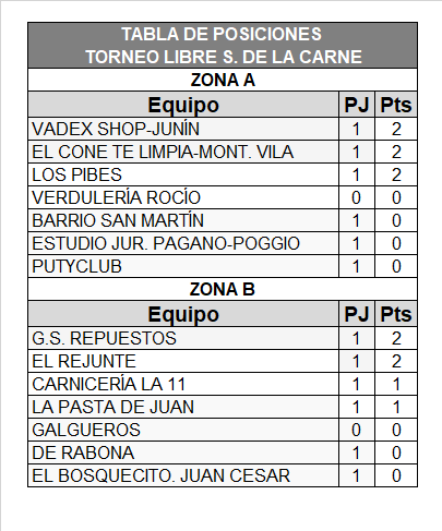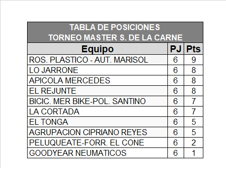 Denominada de esa manera, los planteles que la integran son: El Bosquecito-Peluquería Juan Cesar, El Rejunte, Gs Repuestos, Carnicería la 11, La Pasta de Juan y De Rabona. El último y actual campeón, GS Repuestos comenzó bien y dejó de lado por la mínima diferencia, uno a cero al Bosquecito-Peluquería Juan Cesar. Carnicería la 11 y La Pasta de Juan no se sacaron ventajas y terminaron empardados en dos. De Rabona tuvo un duro escollo enfrente y nada pudo hacer frente al poderío del Rejunte. La historia finalizó 1-3 en contra de los de casaca amarilla y roja, De Rabona.