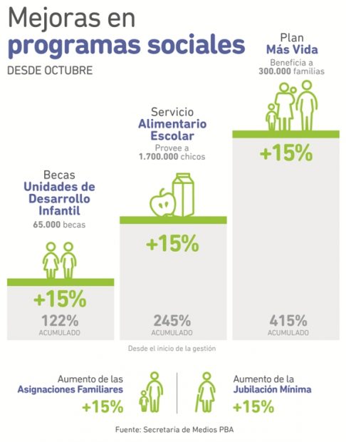 En la mañana de este miércoles, la gobernadora de la provincia de Buenos Aires, María Eugenia Vidal, anunció el incremento de 500 millones de pesos para los programas sociales, servicio alimentario educativo, las jubilaciones mínimas y las asignaciones familiares de los empleados públicos.