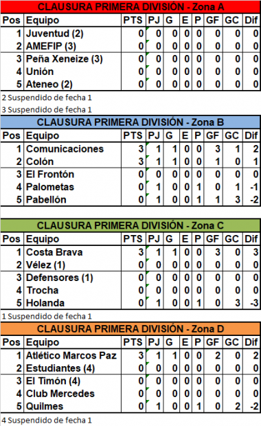 El primer partido de la jornada fue la victoria de Comunicaciones por 3 a 1 ante Pabellón de Marcos Paz. El equipo de Julio Torres cambió la imagen respecto al torneo Apertura y comenzó sumando de a tres. Luego, Colón derrotó por la mínima a Palometas. Estos dos encuentros fueron por la Zona B. Costa Brava, por la C, se aprovechó de un Holanda que sigue sin levantar cabeza y lo goleó 3 a 0.