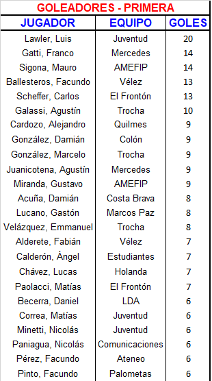 | Juventud | 2 | Lucas Pérez Zunino (2) |