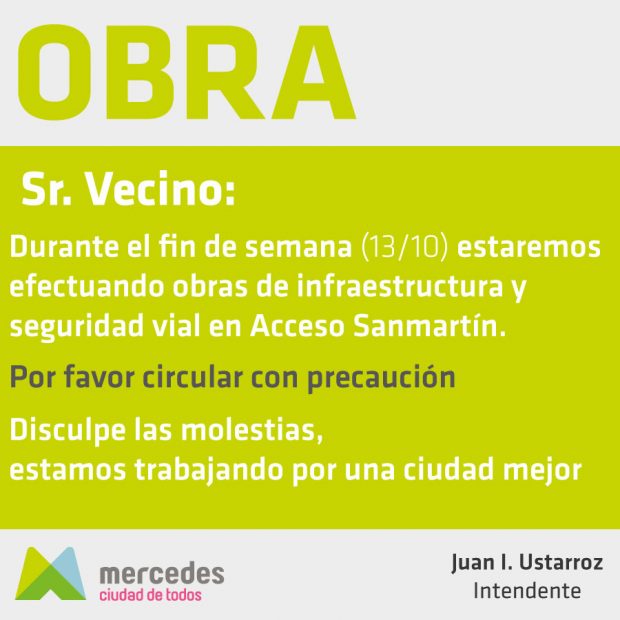 Durante el fin de semana largo se estarán realizando obras de infraestructura en Acceso Sanmartin. La Municipalidad de Mercedes informó que se está trabajando en demarcación vial y mejoras, tal como fuera licitado tiempo atrás. Por tal motivo se solicita circular con precaución. La acción se ejecuta con fondos municipales.