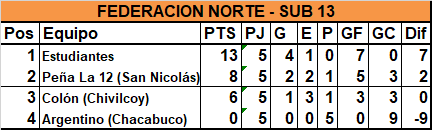 Entre lunes y martes se jugó la quinta fecha del torneo Sub 13 de Clubes organizado por la Federación Norte de Fútbol. Estudiantes derrotó 2 a 0 a Argentino de Chacabuco y logró la clasificación en forma invicta, mientras que su rival quedó eliminado. Pelean por el segundo lugar Peña La 12 de Chacabuco y Colón de Chivilcoy, que empataron cero a cero.