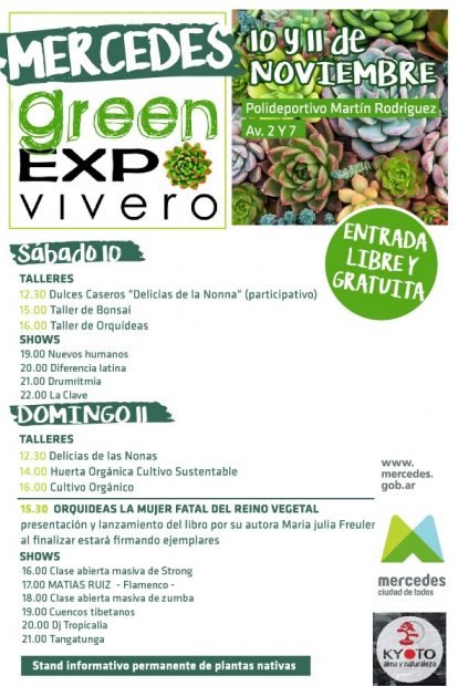 El Municipio de Mercedes, a través de la Dirección de Turismo, en un trabajo mancomunado con la organización Green Expo Vivero, anunciaron una nueva propuesta para nuestra ciudad, la Mercedes Expo Green. La misma se llevará a cabo el sábado 10 y domingo 11 de noviembre, con entrada libre y gratuita en el polideportivo Martín Rodríguez (Av. 2 y 7). “Este es un nuevo desafío que asume la Municipalidad en un marco de trabajo donde nuestra apuesta es tener una ciudad verde y forestada” expresó el intendente Juan Ignacio Ustarroz.