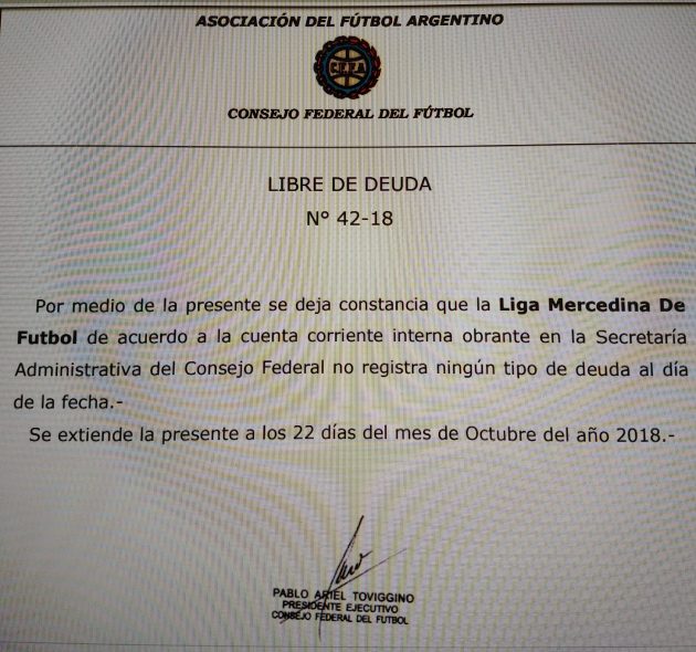 A partir de esto es que la Liga informó a los clubes afiliados y a la sociedad en general que la entidad recibió la homologación de parte del Torneo 2018 y a su vez la nota de Libre Deuda, donde se informa que la Liga Mercedina no tiene ningún tipo de deuda con el Consejo Federal.