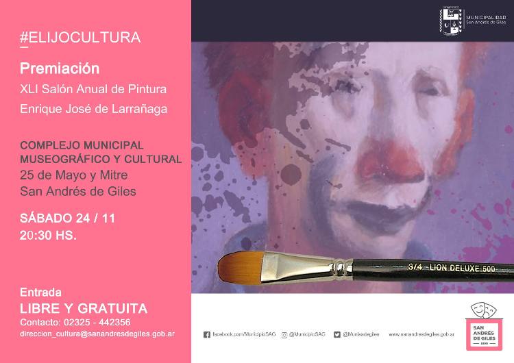 La premiación e inauguración del XLI Salón Anual de Pintura Enrique José de Larrañaga será el 24 de noviembre, 20:30 horas, en el Complejo Municipal Museográfico y Cultural (25 de Mayo y Mitre) en San Andrés de Giles. Entrada libre y gratuita.