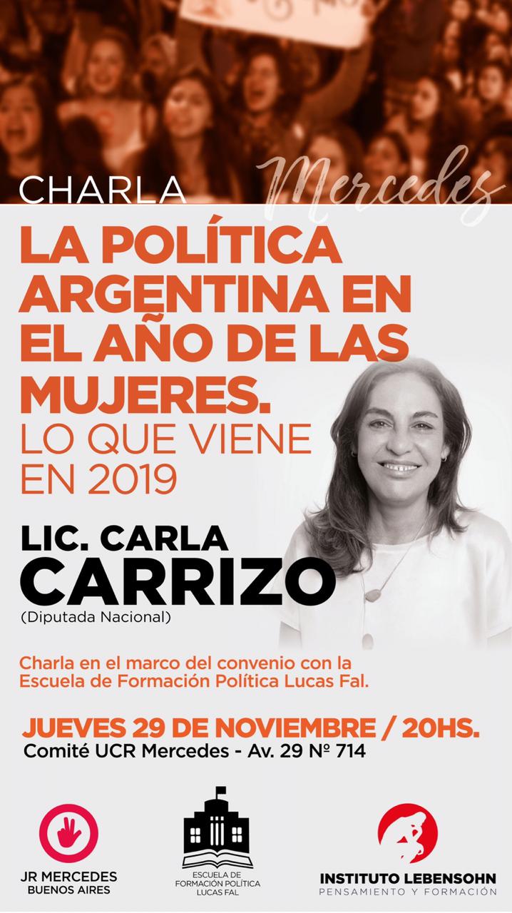 Como última actividad del año de la Escuela de Formación Política «Lucas Fal» que lleva adelante la Unión Cívica Radical de Mercedes y su juventud, este jueves 29 de noviembre, a la hora 20, estará presente en el Comité de Distrito (avenida 29 N° 714), la Diputada Nacional Lic. Carla Carrizo. La legisladora disertará «La política Argentina, en el año de las mujeres. Lo que viene en 2019». En este marco, se firmará el convenio con el Instituto Moisés Lebensohn. La entrada es libre y gratuita y la Escuela aprovecha la oportunidad para invitar a todos aquellos, especialmente a los jóvenes, que se encuentren interesados .