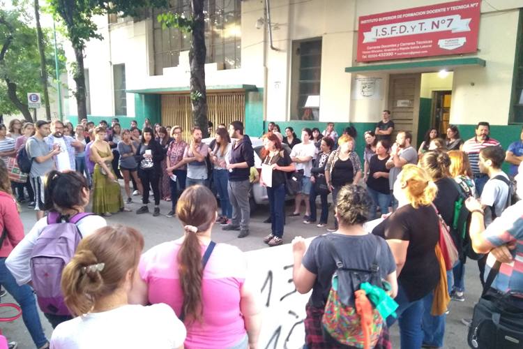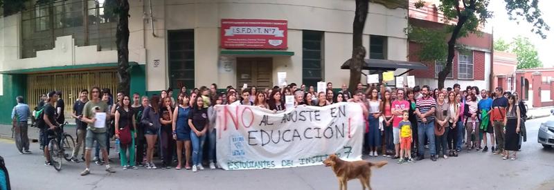 En la tarde del miércoles, los estudiantes y docentes del Instituto Superior de Formación Docente y Técnica N° 7 se concentraron delante del edificio para hacer un abrazo simbólico a la institución a modo de protesta por la cancelación de la inscripción para el primer año de los profesorados de Historia y Geografía. A cambio, la provincia solicita la apertura del profesorado de Matemáticas. No obstante, los estudiantes piden que la oferta incluya todas las propuestas.