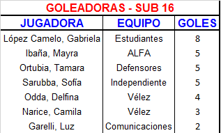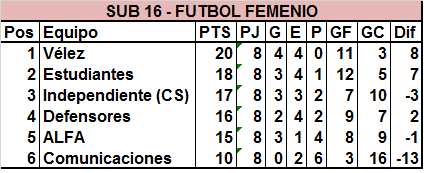 En cuanto a la categoría Sub 16, se jugó la antepenúltima jornada y fue Vélez el que sacó ventaja luego que hace dos fechas haya un triple empate en el liderazgo de la tabla. Las del Molino derrotaron a Defensores y aprovecharon la derrota de Estudiantes ante Independiente de Capitán Sarmiento.