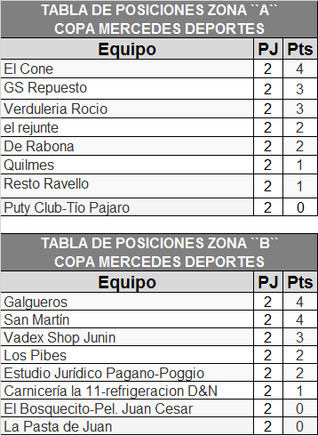 Luego de las lluvias de las lluvias del fin de semana pasado, las cuales permitieron que solamente se disputen los encuentros del día viernes, pudo completarse la segunda fecha de la Copa Mercedes Deportes, organizada por Walter Banega en el destacado campo de deportes del Sindicato de la Carne de Mercedes. Recordemos que en el comienzo de la fecha, Estudio Jurídico Pagano-Poggio cayó ante Los Pibes por tres tantos contra dos, y San Martín superó por cinco a tres a El Bosquecito Peluquería Juan Cesar.