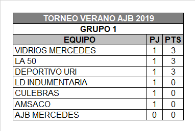Con un sol a pleno se pudo observar y vivir fútbol del bueno en la Asociación de Judiciales Bonaerenses. Los equipos intervinientes de este torneo de verano son: AJB Mercedes, LD Indumentaria, Deportivo Uri, Amsaco, Vidrios Mercedes, Culebras y La 50. La primera fecha chocó a Deportivo Uri contra LD indumentaria, Culebras ante La 50 y Vidrios Mercedes se midió frente a Amsaco.