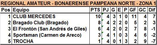 En la ciudad de Bragado se jugó el segundo y último partido de la quinta fecha del torneo Regional Amateur y Bragado Club no le quiso perder pisada a Club Mercedes y venció a Sportsman de Carmen de Areco por 1 a 0. Juan Citate fue quien marcó el único gol del encuentro a los 25 minutos del segundo tiempo en un encuentro que fue muy entretenido.