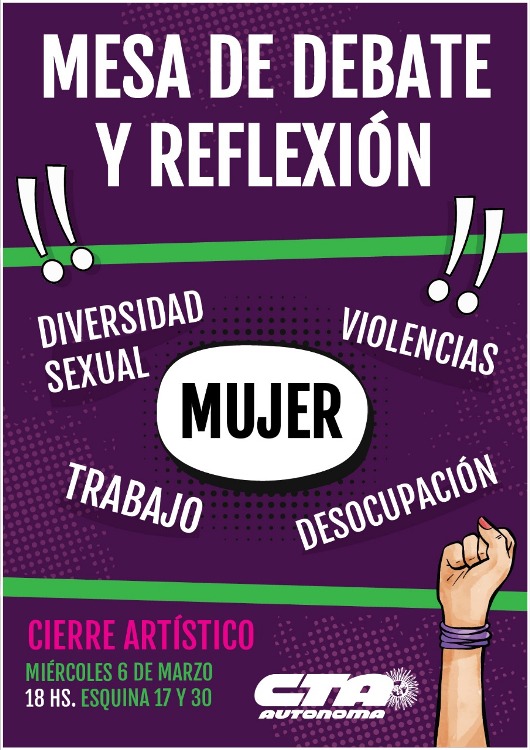 Desde la Secretaria de Género e Igualdad de oportunidades de CTA Autónoma Mercedes anunciaron que el día 6 de marzo, 18 horas, realizará una mesa de debate y reflexión en conmemoración del 8 de marzo, Día internacional de la Mujer Trabajadora.
