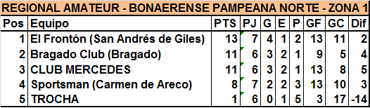 En el otro encuentro Mercedes y Sportsman empataron 2 a 2, quedando la tabla de posiciones de la siguiente manera: Fronton 13, Bragado y Mercedes 11, Sportsman 8 y Trocha 1
