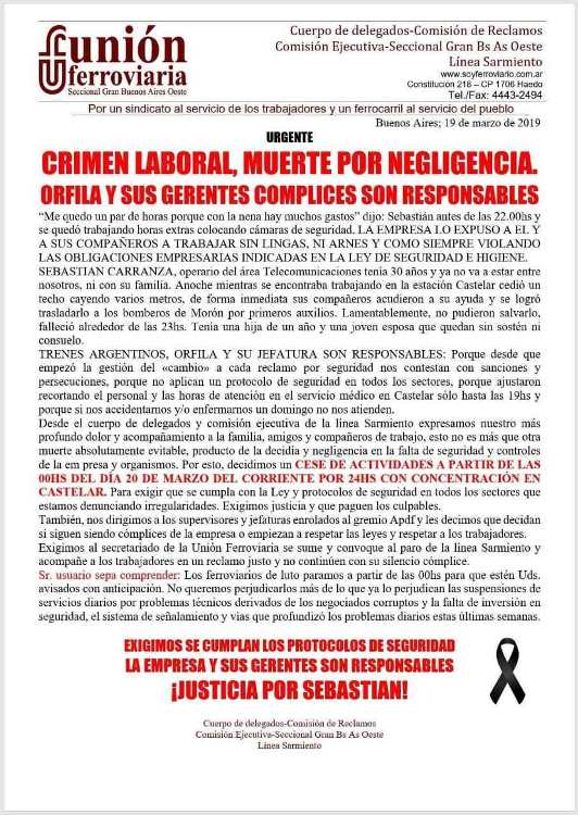Los trabajadores del Ferrocarril Sarmiento convocaron a un paro por 24 horas a partir de las 0 de mañana miércoles 20 de marzo en protesta por la muerte de un empleado del área de telecomunicaciones que estaba colocando una cámara de seguridad en el techo de la estación Castelar.