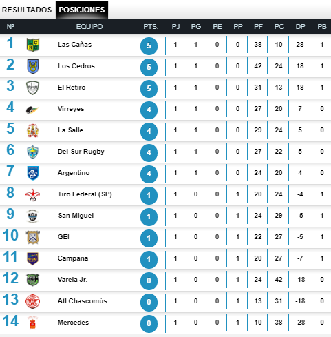 Rugby Champagne Web. Las Cañas derrotó a Mercedes por 38 a 10 (5 a 1 en tries), Los Cedros goleó a Varela Jr. en su cancha por 42 a 24 (6 a 2 en tries) y El Retiro hizo lo propio en su viaje a la laguna, para superar a Atlético Chascomús por 31 a 13 (5 a 1 en tries).
