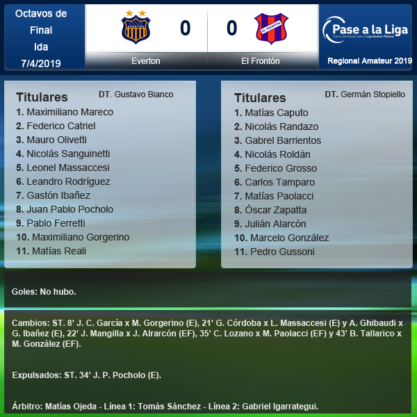 Pase a la Liga. Por la ida de los Octavos de final del Regional Amateur, Everton no pudo comenzar la serie con una victoria e igualó sin goles ante El Frontón. Fue un partido intenso donde los dos buscaron el tanto pero este nunca llegó. Cerca del final del partido Pocholo vio la segunda amarilla y los de Bianco culminaron el encuentro con 10 hombres.