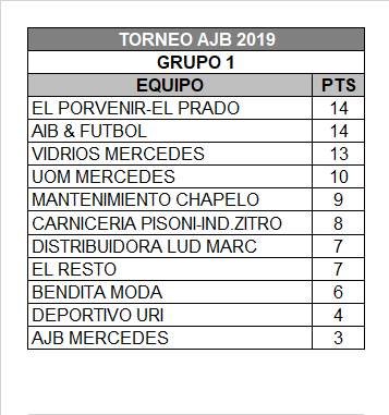 Juntos en lo más alto Como se mencionó anteriormente El Porvenir-El Prado y AIB & Futbol encabezan la ajustada clasificación. En primera instancia, el conjunto de doble sponsor no la tuvo nada fácil contra Carnicería Pisoni-IndZitro, un duro adversario que no da ninguna pelota por perdida, y brinda pelea hasta el último minuto del match. Del cero no paso el marcador, y se repartieron un punto para cada uno. En lo que hace a la performance de Carnicería Pisoni-IndZitro se ubica sexto en la tabla con ocho puntos. AIB & Futbol se medía ante la UOM Mercedes, otro plantel que se lo quiebra tan fácil, debido a la jerarquía que poseen cada uno de sus jugadores. Los del “Turco” Bacri plantearon bien el partido, pero un pequeño error fue aprovechado por el rival. La UOM Mercedes consiguió el definitivo uno a uno, y ya suma 10 puntos, a cuatro de los primeros.