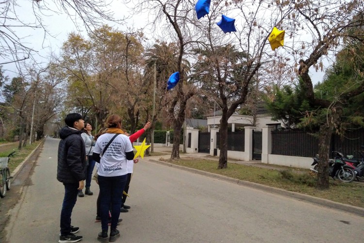Los familiares de Juan, descubrieron la señal de tránsito con la Estrella Amarilla y luego lanzaron al aire globos en formato de estrellas de colores amarillos y azules.