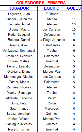 | Los Carteros | 4 | Mauro Sigona 2, Franco Torres y Jonatan Bartolomeo |