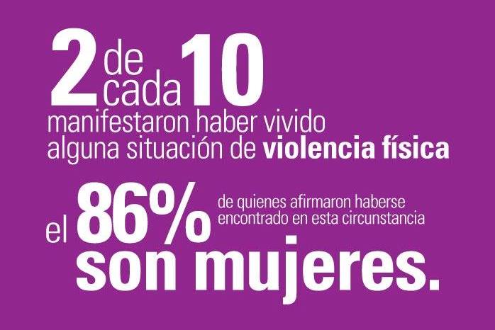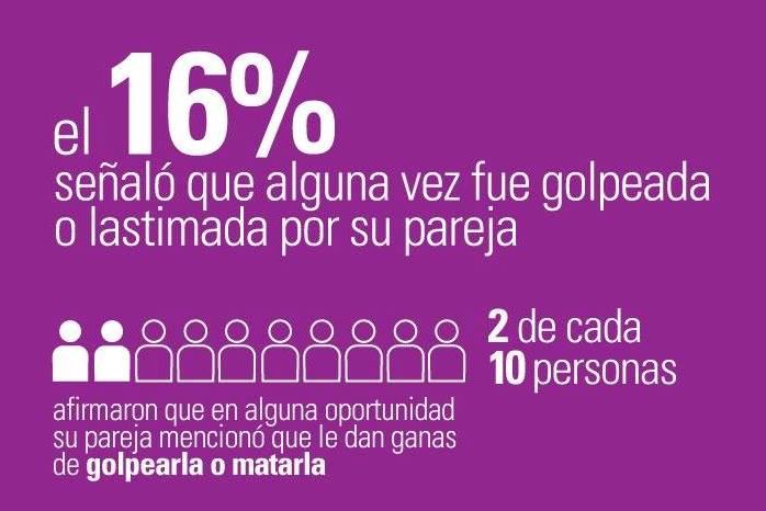 Además, 2 de cada 10 personas, en su mayoría mujeres, afirmaron que en alguna oportunidad su pareja mencionó que le dieron ganas de golpearla o matarla. El 16% señaló que al menos una vez fueron golpeadas o lastimadas por su pareja, ya sea con alguna parte de su cuerpo o con un objeto. Dentro de este grupo, el 86% son mujeres.