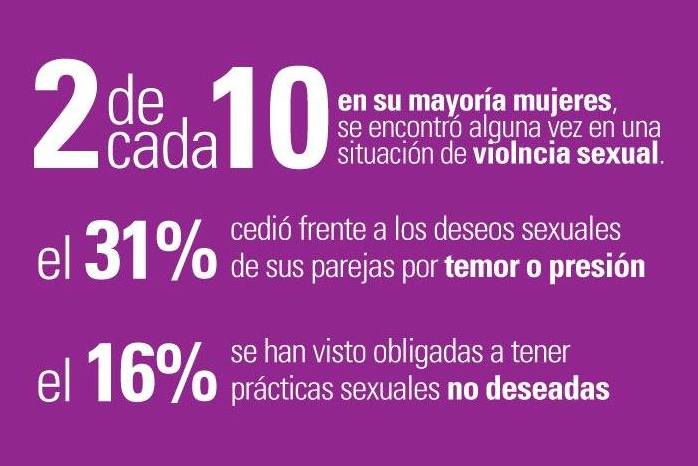 En cuanto a la violencia sexual, 2 de cada 10 personas, en su mayoría mujeres, señalaron que al menos alguna vez se encontraron en una situación de este tipo, tanto quienes cedieron frente a los deseos sexuales de sus parejas por temor o presión (el 31% de los casos) como aquellas que se han visto obligadas a tener prácticas sexuales no deseadas (el 16%).