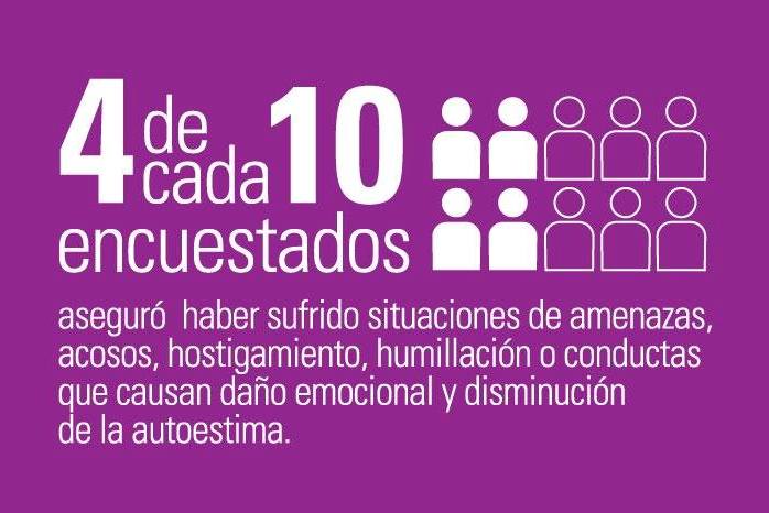 La encuesta también analizó las conductas que causan daño emocional y disminución de la autoestima o que perjudican y perturban el pleno desarrollo personal mediante amenazas, acosos, hostigamiento o humillación, entre otros factores. En este caso, 4 de cada 10 personas encuestadas aseguraron haber sufrido episodios de este tipo al menos una vez.