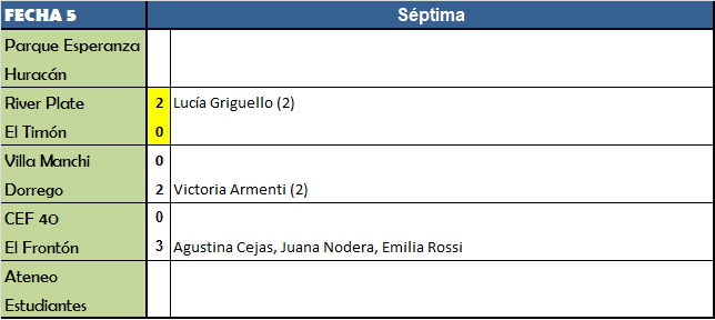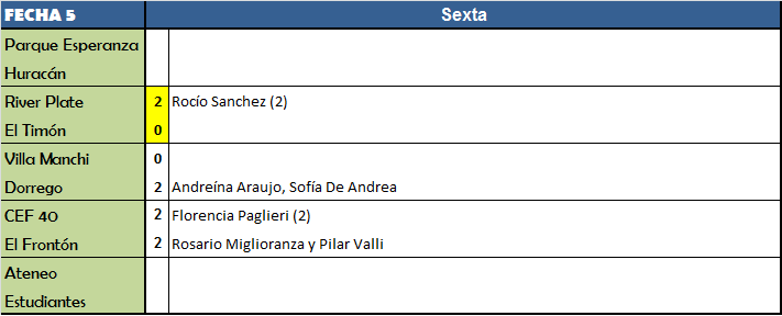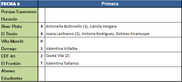 Debido a la lluvia de esta semana, los partidos que restaban jugarse por la quinta fecha, se suspendieron, por lo que deberán reprogramarse Ateneo Vs. Estudiantes y Parque Esperanza Vs. Huracán, siendo éstos los primeros dos encuentros que van a quedar pendientes en el torneo.
