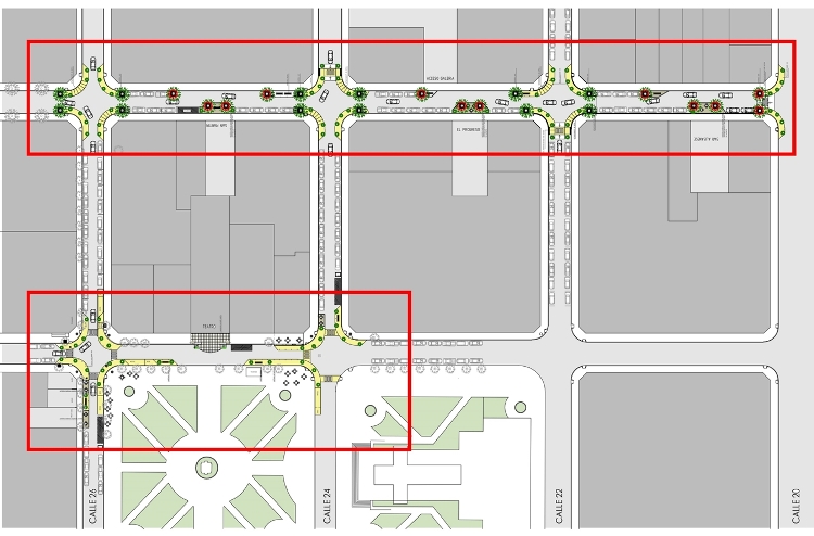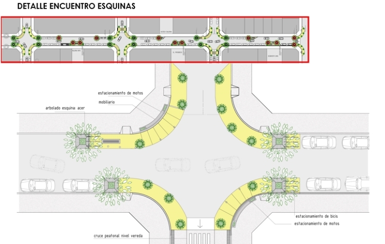 En ese sentido se detalló que las tareas incluyen intervenciones en las esquinas y bocacalles para aumentar la seguridad de los peatones a través de la elevación de las sendas peatonales y el ensanche de las esquinas con el objetivo de generar carriles más angostos para reducir la velocidad del tráfico y un mayor espacio de uso para el peatón, mediante elementos de contención como bolardos, macetas y delimitación del sector con pintura en la calzada.