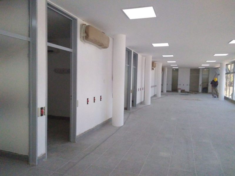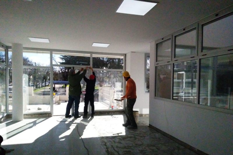 El recorrido continuó por la sala vidriada que puede observarse desde afuera. En el ingreso por la esquina hay una rampa lindera con la escalera de ingreso que por estos días estaban terminando uno de los cincuenta obreros que están en la obra con los detalles finales. Día y noche, durante la semana y fines de semana también trabajan para concluir con la obra a la que periódicamente auditan desde Obras Pública Bonaerense y de Infraestructura Hospitalaria.