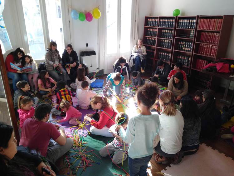 A la tarde había tres actividades en paralelo. Eso significó que a la vez más de cien chicos con sus familias jueguen en algunas de las salas de la CEM. En una de las salas, el Taller de los Sentidos de Celeste González Canga proponía un taller de collage móvil. En otra, Giro Didáctico Mercedes presentó un espacio de juegos y lectura. Y en la tercera sala, La Placita Delivery instaló una placita blanda para los más pequeños.