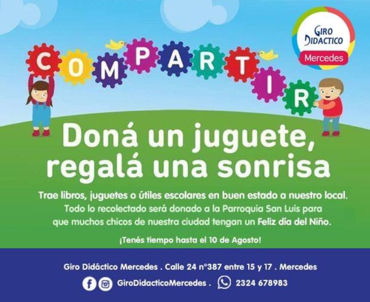 Con el fin de fomentar la solidaridad entre los niños, el comercio Giro Didáctico invita a las familias de la ciudad a «donar un juguete para regalar sonrisas». Es así que proponen que lleven juguetes, libros o útiles escolares en buen estado y que las familias no los utilicen más para ser entregado a la Parroquia San Luis en el marco por el Día del Niño.