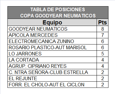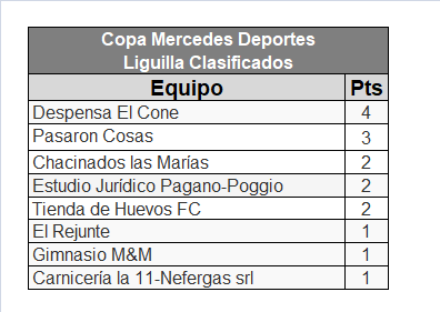 Forrajería El Cholo-Autoservicio El Ciclón no pudo frente a la supremacía de Apícola Mercedes, y fue vencido por cuatro goles contra dos, descontando en esas dos oportunidades que tuvo. El Rejunte y Electromecánica Zunino no pasaron del cero, y se repartieron un punto para cada uno.