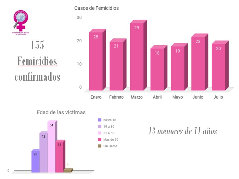 El Observatorio de Femicidios del Defensor del Pueblo de la Nación detectó, en todo el país, 155 femicidios durante el período comprendido entre el 1º de enero y el 31 de julio del 2019, de los cuales 18 son vinculados y seis son personas Trans. La provincia en la que más casos se produjeron fue Buenos Aires, con un total de 62 en lo que va del año.