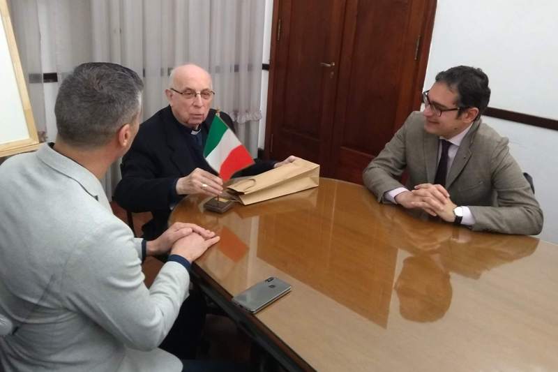 Promediando la tarde, la comitiva italiana llegó a la ciudad y mantuvo un primer encuentro con el Arzobispo de Mercedes – Luján, Monseñor Agustín Radrizzani que los atendió en la sala de reuniones de la sede arquidiocesana de calle 22 y en donde dialogaron del Papa Francisco y sus antecesores, así como los concilios católicas, habida cuenta de que el Cónsul es nacido en Roma.