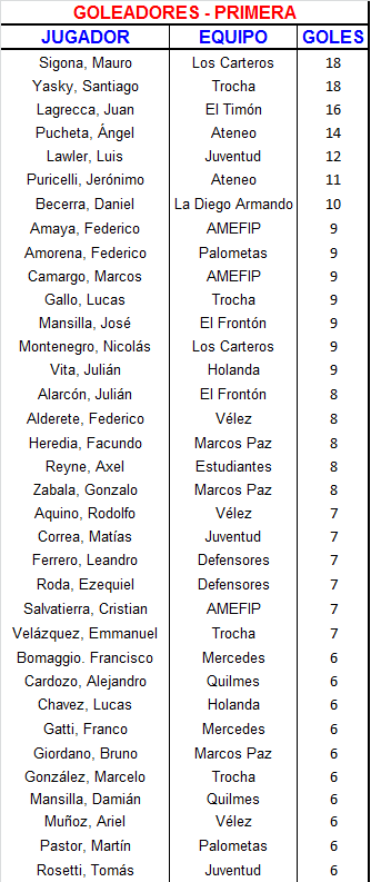 | Trocha | 13 | Santiago Yasky 6, Lucas Gallo 4 y Marcelo González 3 |