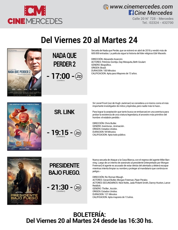El Cine Mercedes presenta para este fin de semana tres películas para elegir. En la primera función se podrá ver «Nada que Perder 2» (17 horas), mientras que los más pequeños podrán optar por la película de animación «Sr. Link» (19:15 horas) y por último, la acción llega de la mano de «Presidente bajo Fuego» (21:30 horas)
