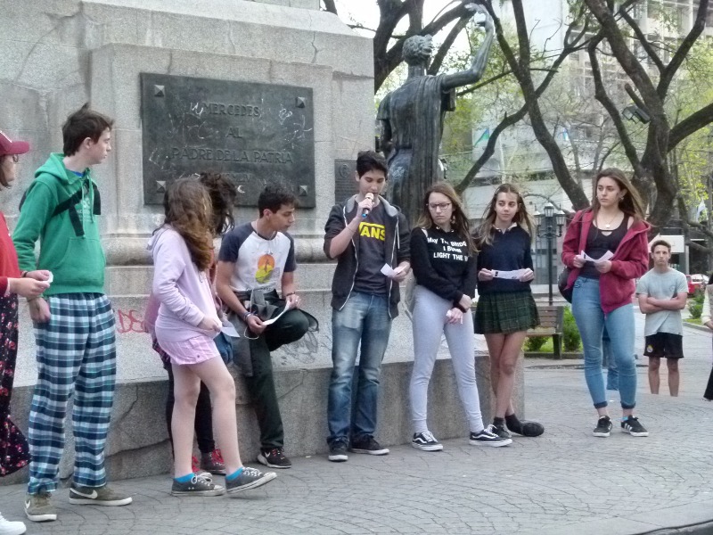 De nuevo en la plaza, con el sol todavía arriba, se proyectó un video con un mensaje del Dr. Miguel Palma, científico mercedino que meses atrás brindó varias charlas sobre la problemática internacional que afecta al planeta y al ambiente. En el mensaje hacia los jóvenes los instó a cuidar “la tierra prestada de futuras generaciones”. “Lo que hagamos en estas generaciones, la de ustedes y la de sus hijos, va a determinar las condiciones en la que van a vivir en nuestro planeta durante las próximas décadas y siglos”, expresó el investigador internacional.